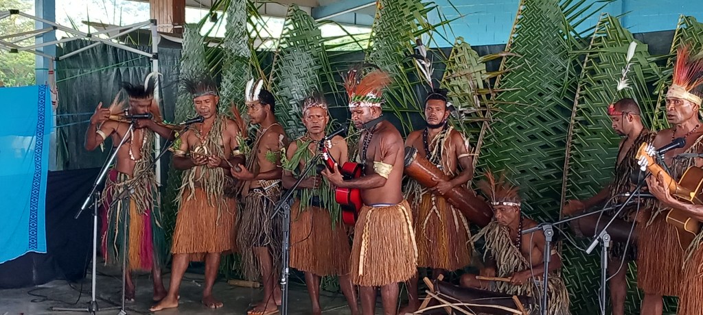 Spectacularly painted bodies  – charcoal used over their skin, water colour paint for the decoration.  All manner of plants and feathers used in headdresses and skirts.  Each tribe has its own costumes and customs.  Several tribal dances were performed for us  – also a young mother, with the most beautiful voice, sang both a lullaby that she sings to her babies, and then wowed us with a rendition of Halleluiah!