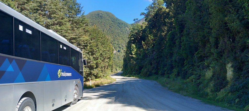 I should explain here that this dirt road was built to aid the construction of New Zealand’s biggest hydro electric station. Construction began in 1964 – it took 8 years and 1800 men to build it under extremely difficult circumstances. The generating units were built 200 metres BELOW the surface of Lake Manipuri, chiselling into a granite mountain! A ten-kilometre tailrace tunnel was excavated to take the water out of the station and into Doubtful Sound. A second tunnel was completed in 2002 which brought the station up to its full capacity. Workers were housed in makeshift temporary accommodation in the bush, all of which has been totally cleared away. However, the road now serves another purpose in that it brings tourists (in their thousands!) to Doubtful Sound.