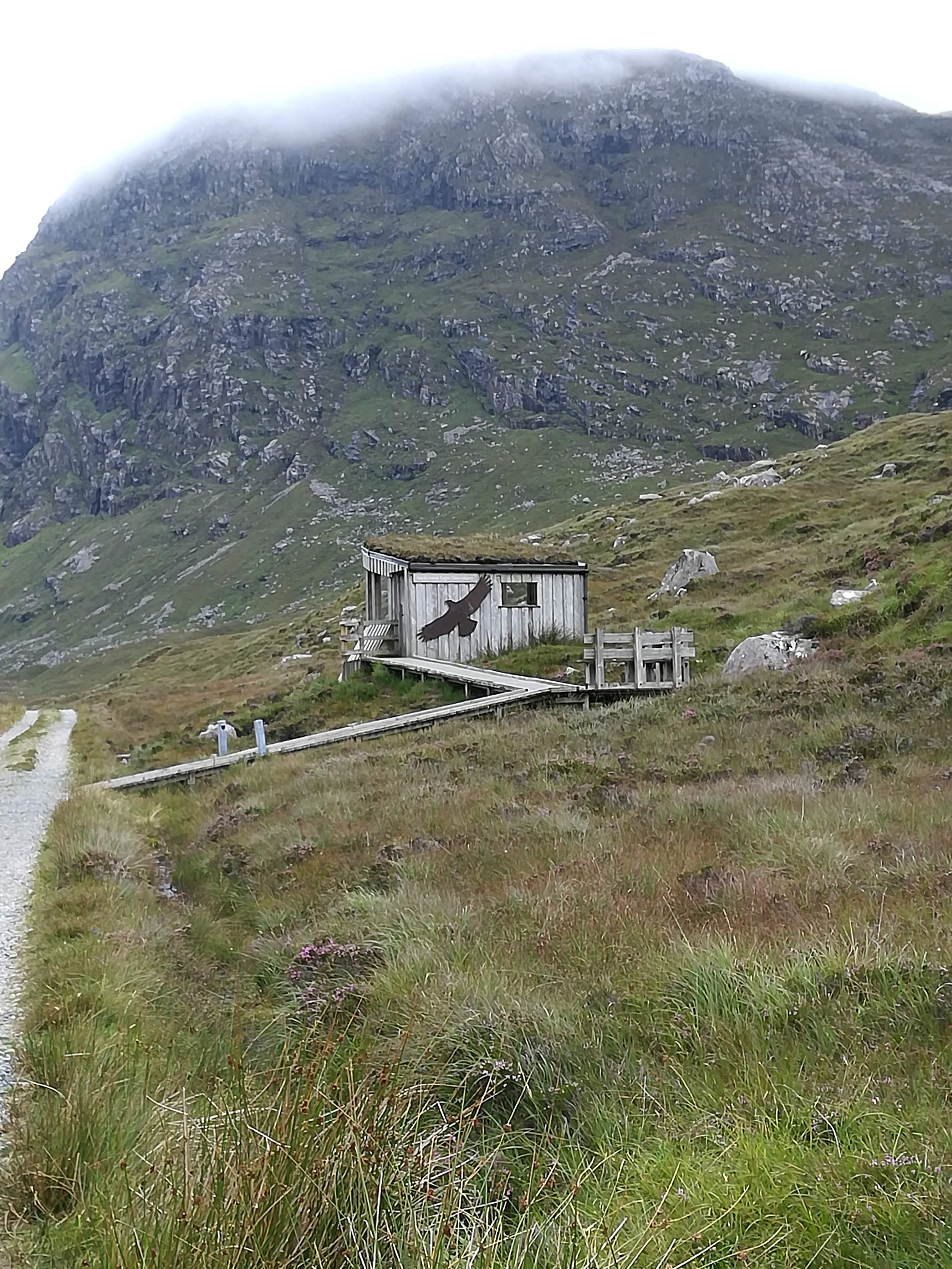 Given our pathetic record for seeing any wildlife, the Eagle Observatory was like a magnet to us! A 45-minute walk up the valley of the River Mhiabhaig – mostly peat bog on the valley floor, with the mountains rising up on either side. The Reynolds ‘jinx’ took over again . . .. the clouds rolled in over the higher peaks as we approached the ‘observatory’. As you’ll see from the photo, it is a little wooden hide-out – where we sat for some time with our binos – WE DIDN’T SEE ANYTHING! If the eagles were soaring, we couldn’t see them! As we commented on the walk back down the valley, we didn’t even see a rabbit! The valley was silent . . ..