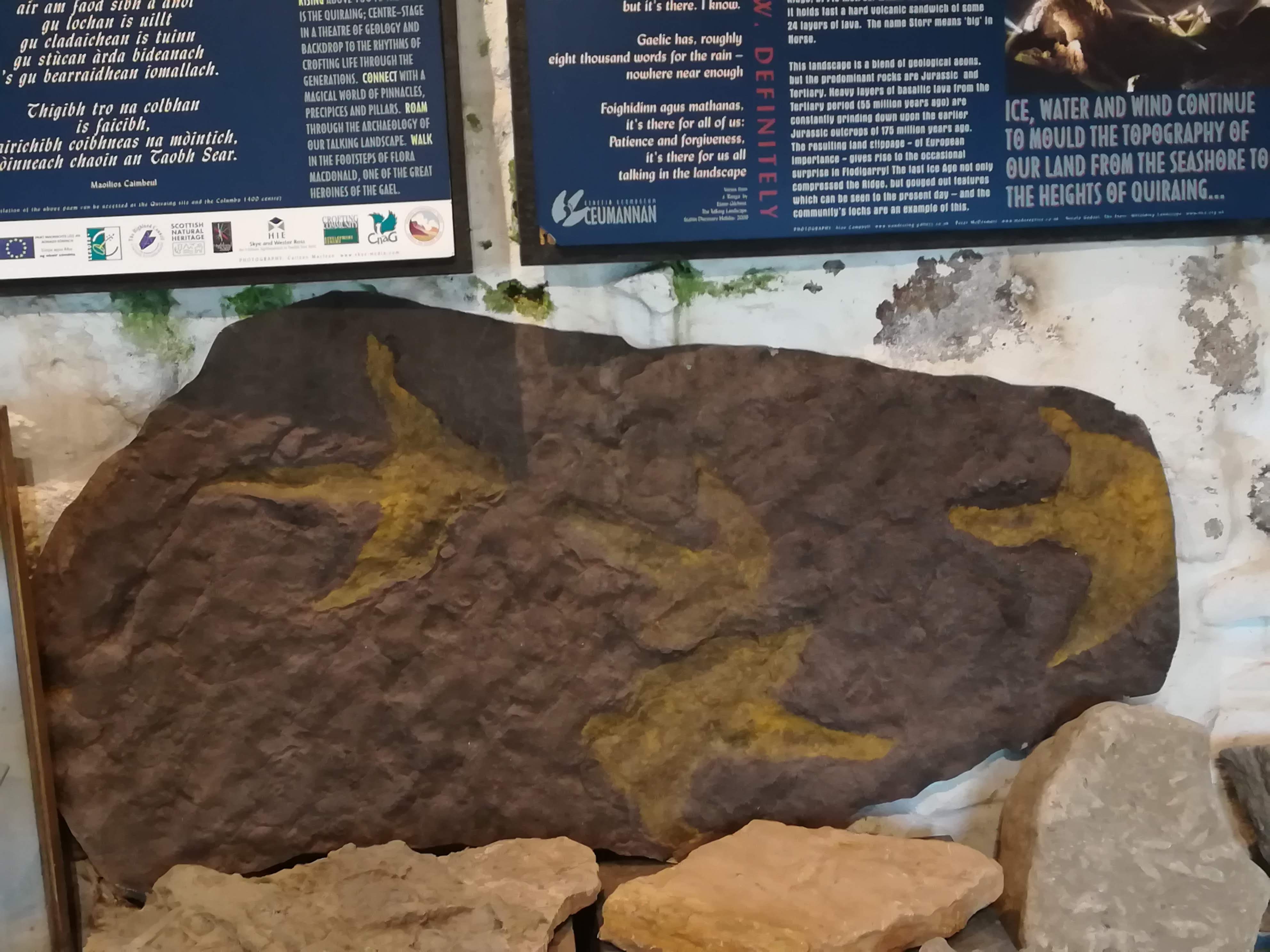Searching for dinosaur footprints at low tide/ A recently found fossil from a beach near Staffin