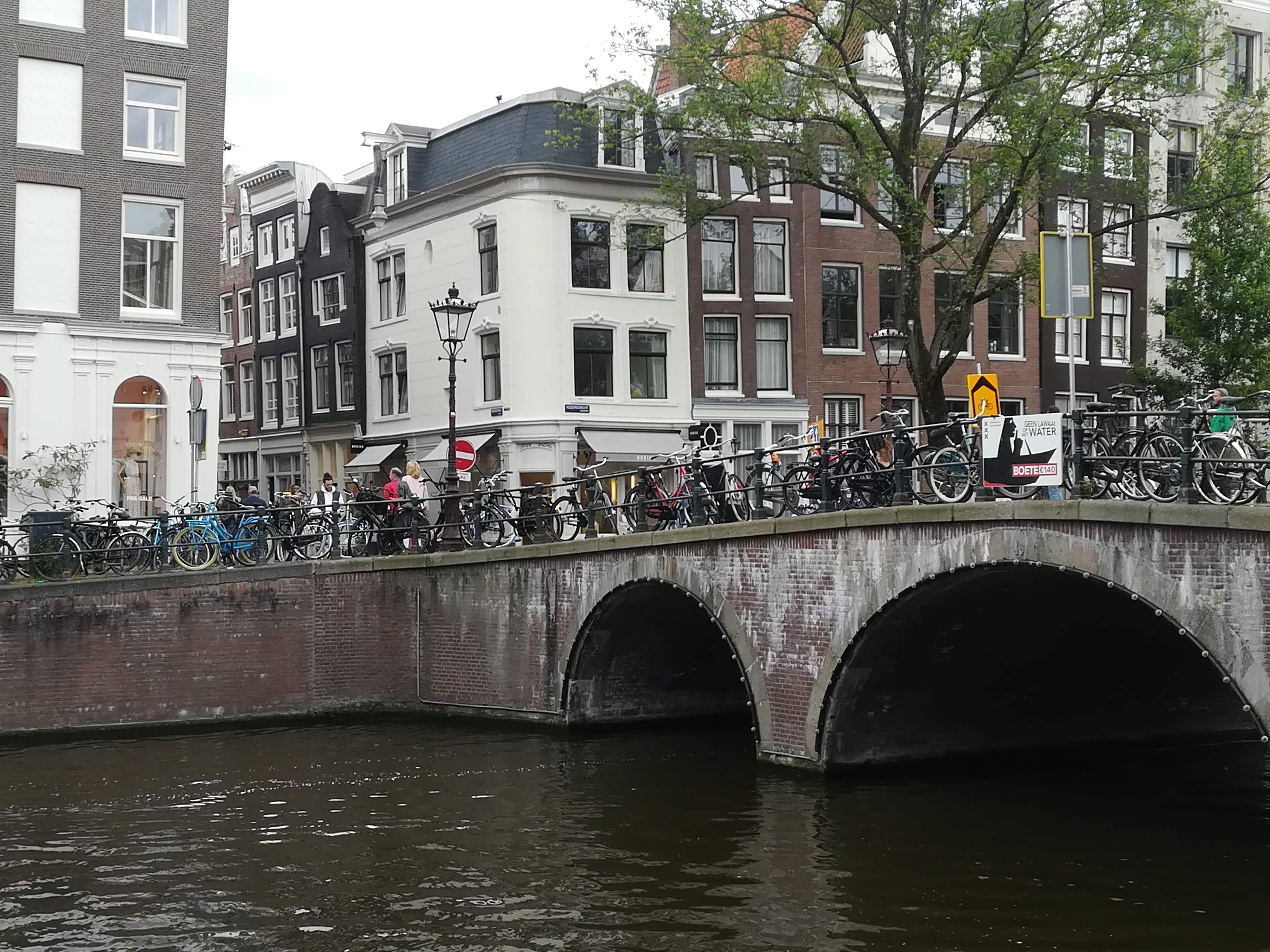 Thanks to a Camping & Motorhome Club recommendation, we moved to Gaasperplas Camping on the outskirts of Amsterdam. A convenient 10-minute walk from a Metro station, then 25 mins on the Metro took us to Central Station in the middle of Amsterdam city. Despite its checkered history – prosperous 17th century, economic decline in the 18th century, re-emergence of wealth in the 19th century, growing inequalities & emancipation, along with war and repression in the 20th century – Amsterdam is now a truly vibrant city. Pretty canal bridges are adorned with flowers, fascinating architecture (see more below) wherever you look. Bicycles and trams are the main mode of transport, and we needed ‘eyes in the backs of our heads’ to avoid bicycles coming from behind, in front and to either side. BICYCLES HAVE RIGHT OF WAY here, and it takes some getting used to.