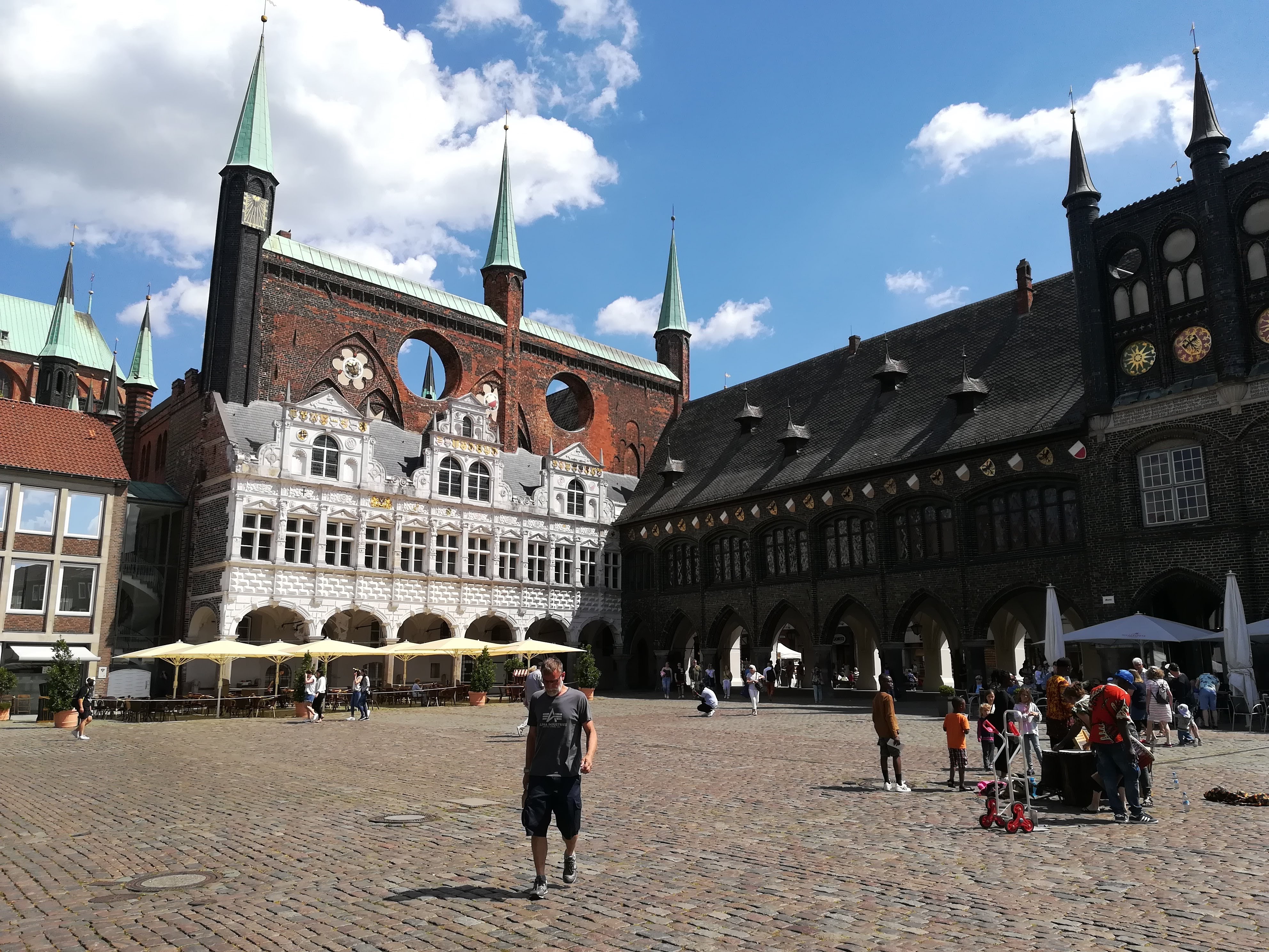 Town Hall & central square – LubeckHoly Spirit Hospital, Lubeck – has been treating patients since the 12th century. The pretty square in front of it, is a quiet place to rest and de-stress, full of herbs and flowersSt Mary’s Basillica was badly bombed during WWII – it has been rebuilt in a very simple style, painted flowers on concrete for decoration. It can be seen from everywhere, being built on the highest point above the river, and boasting twin towers which are more than 400 ft high. The original church bells remain where they fell during the WWII bombing, as a memorial to all those who lost their lives.
