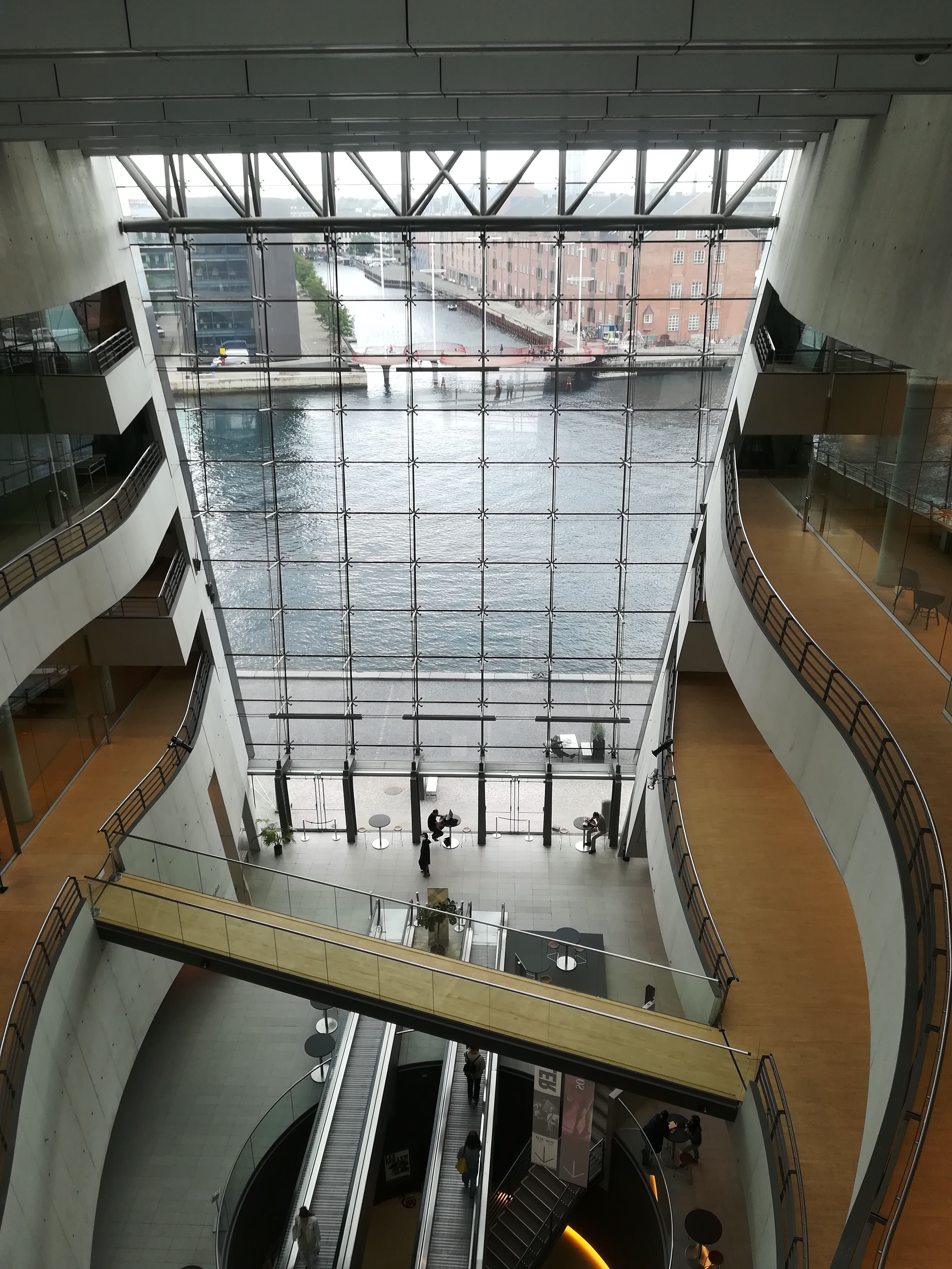 The city library – known as the Black Diamond – the glass sparkles, like a diamond,when the sun shines on the waterView from inside the Black Diamond (top floor) out onto the canals below