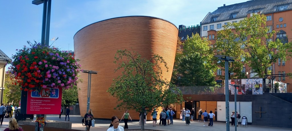 Kampii Chapel was a real treat. Known as the Chapel of Silence, this gem is very modern, and treated as a place for peace and quiet in the middle of a busy area in the city. Its unusual conical shape overlooks one of the many city squares. Three different types of wood were used – the external walls are spruce – the beautiful internal walls are of alder and milled into the curved shape – fittings and doors are made of ash. The ceiling contains plasterboard which adds to the sound proofing effect – you could have heard a pin drop . . . until the next tourist rustled in!